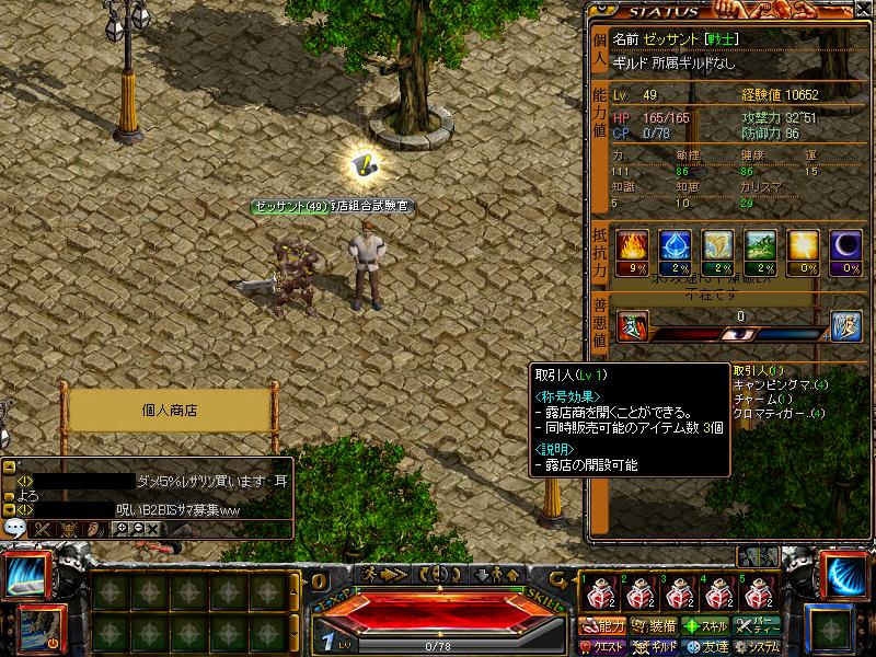 この時点ではまだ47レベルのままで、残り7000ちょっとだったので、再びキャンサー気孔B1に行き、サイドウォーカーという蟹を狩りまくって48レベルに。この蟹はリザードキリングと同じくらいの約800の経験値をもらえるわりに、攻撃力が低く、だいたい3~7ぐらいのダメージしか受けず狩りやすい敵だったので。ただ、このmob、パラメーターの敏捷が高いのか、結構攻撃を避けたり、クリティカルで約15のダメージを与えてきたりしたので、一匹にかける戦闘時間では、リザードキリングよりもかかる場合もあったりしました。